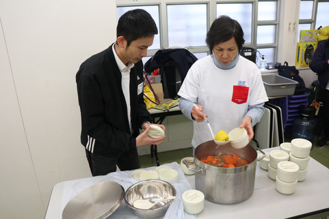 一眾「鄰舍探訪日」學生義工分工合為獨居長者準備「愛心湯」。 Galaxy Fire Services Co. Ltd. 銀河消防集團 銀河消防義工,以及一眾學生義工準備好飯盒一同出發到葵涌邨探訪獨居長者。
